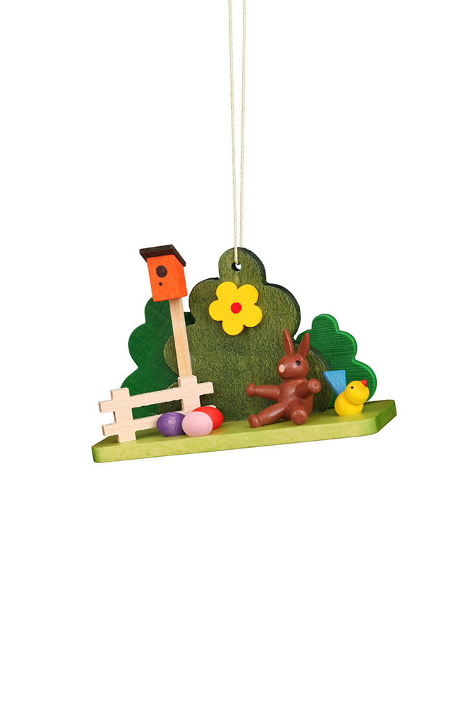Unser Hasenbaby am Buch ist gerade dabei seine farbenfrohen Eier zu verstecken. Eine eigene kleine Miniaturwelt in einem Ornament.