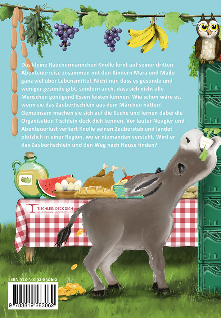 Das kleine Räuchermännchen Knolle lernt auf seiner dritten Abenteuerreise zusammen mit den Kindern Mara und Mailo ganz viel über Lebensmittel. Nicht nur, dass es gesunde und weniger gesunde gibt, sondern auch, dass sich nicht alle Menschen genügend Essen leisten können. Wie schön wäre es, wenn sie das Zaubertischlein aus dem Märchen hätten! Gemeinsam machen sie sich auf die Suche und lernen dabei die Organisation Tischlein deck dich kennen. Vor lauter Neugier und Abenteuerlust verliert Knolle seinen Zauberstab und landet plötzlich in einer Region, wo er niemanden versteht. Wird er das Zaubertischlein und den Weg nach Hause finden?