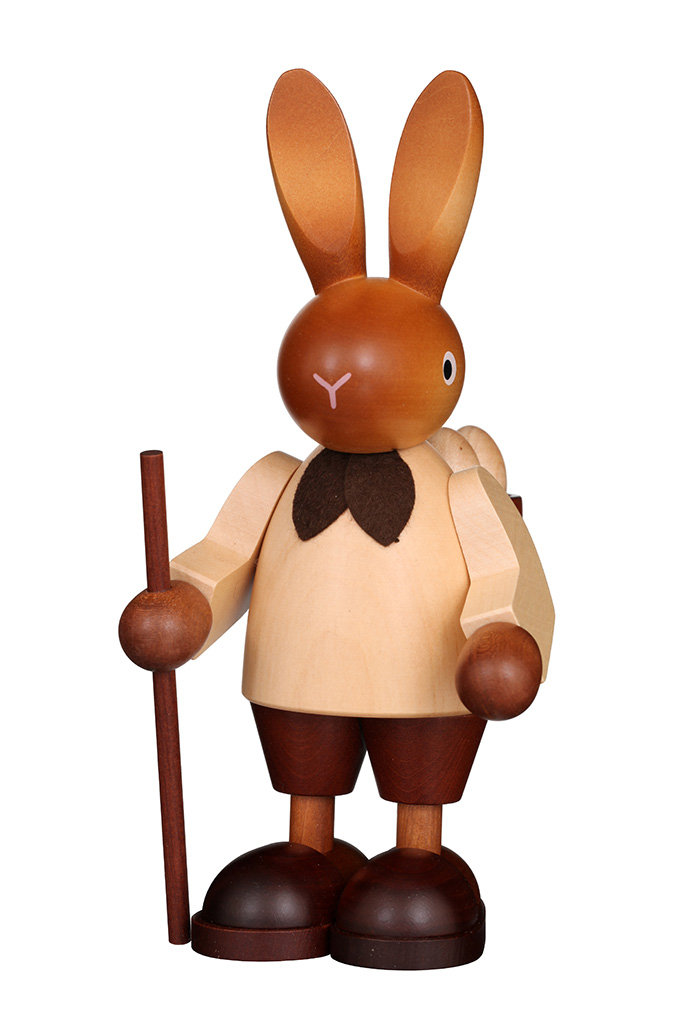 Festlich herausgeputzt mit einer hellen Jacke und ein fesches Tüchlein um den Hals ist der Hasenmann am Ostermorgen unterwegs um die Eier zu verstecken. Schwer schleppt er an der Kiepe. Zum Glück hat er seinen Stock dabei, der ihm ein bisschen Halt bietet.