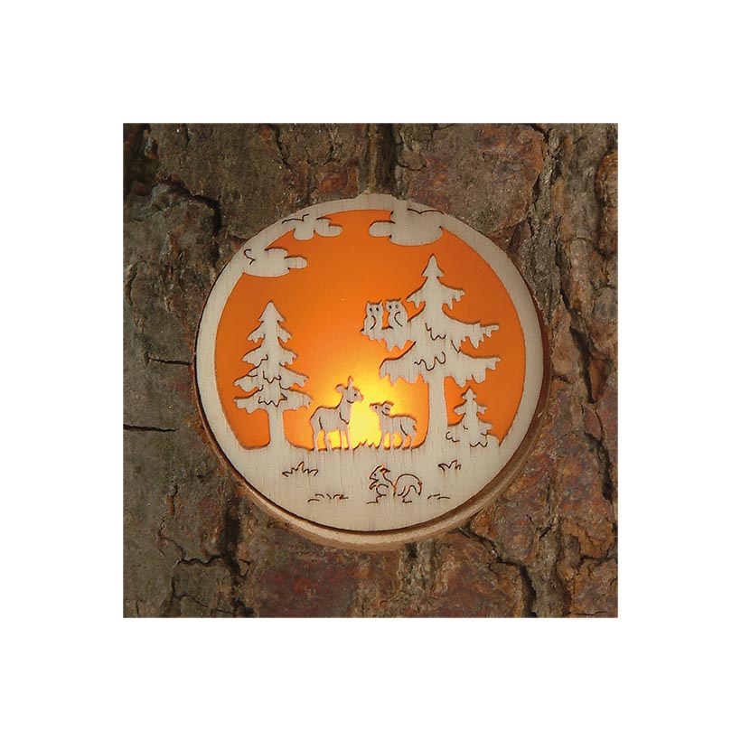 Der Stimmungsleuchter aus Laubholz mit Rinde hat drei verschiedene Jahresmotive.