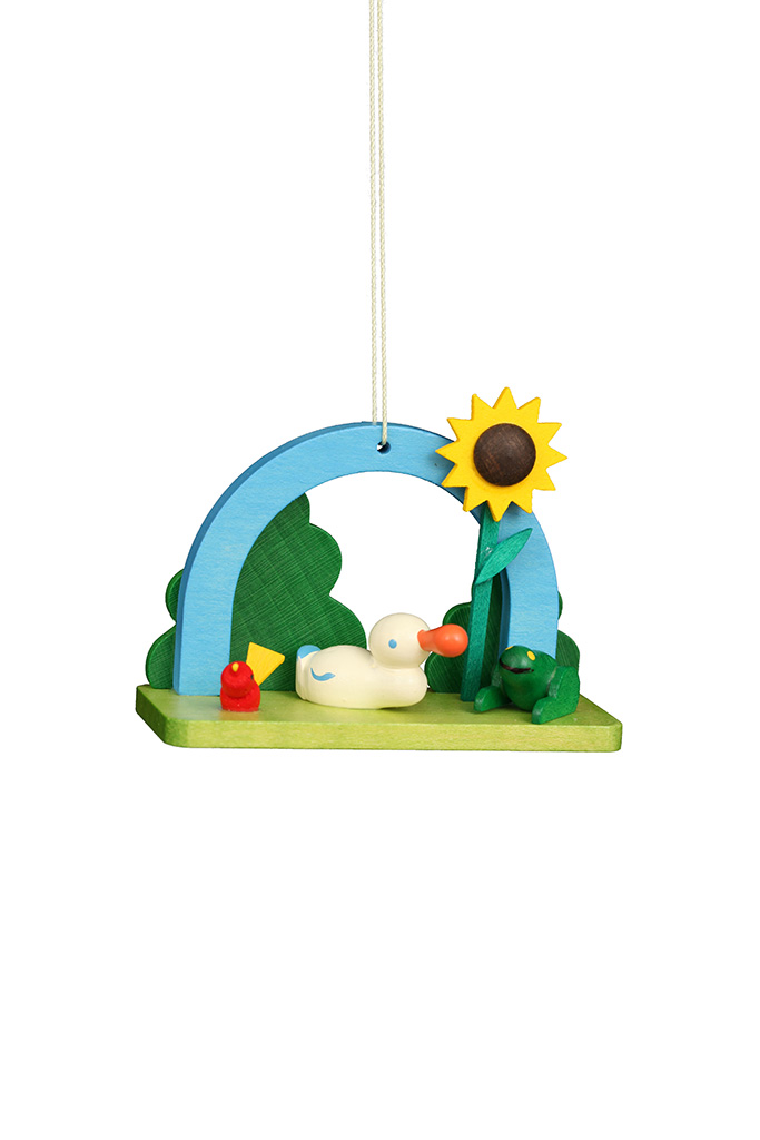 Entlein und Frosch erzählen dem Vögelchen die neusten Ostergeschichten. Eine eigene kleine Miniaturwelt in einem Ornament.