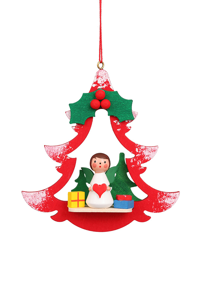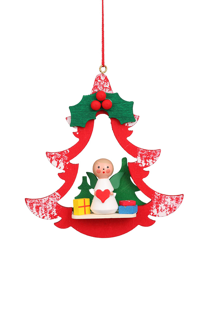 Unter einem großen Tannenbaum sitzt ein kleiner Engel mit Geschenken und wartet auf die Bescherung. Mit dem Herz in der Hand bringt er den Menschen Liebe.