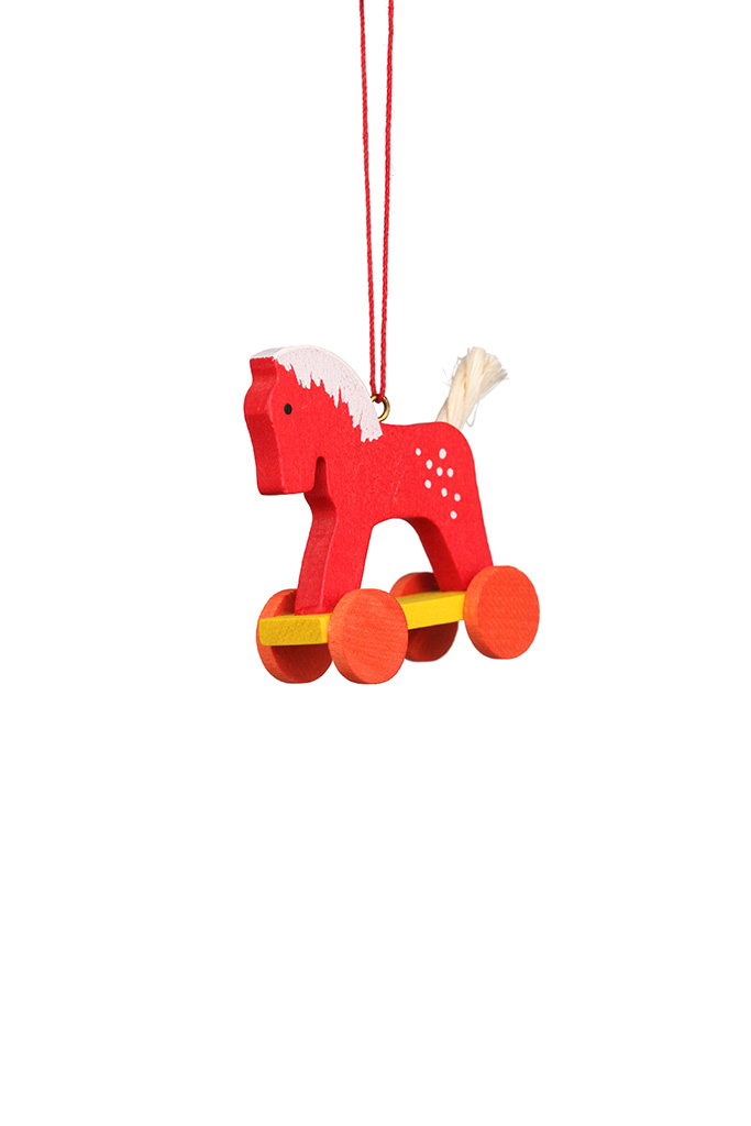 Das rote Spielzeugpferdchen leuchtet im Tannengrün.