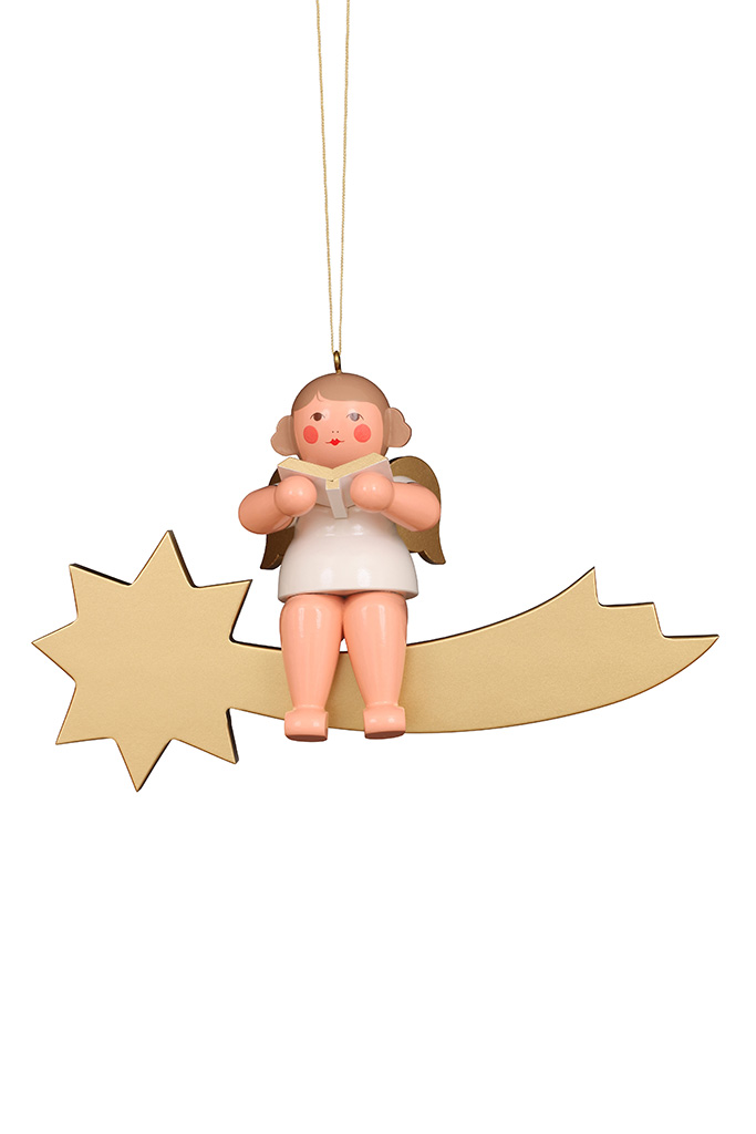Auf der goldenen Sternschnuppe schwebt der Engel durch das Himmelszelt, ein Buch mit himmlischen Geschichten in der Hand.