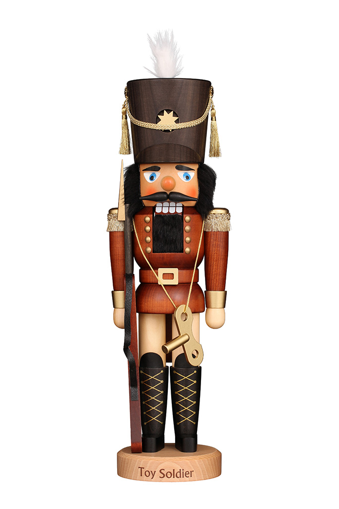 Er wacht über all die tollen Spielsachen. Sehen Sie den Schlüssel, welchen er um seine Schulter gehangen hat? Mit diesem dreht er all die wundervollen Spieldosen auf, welche nicht nur Kinderherzen höherschlagen lassen. Versuchen Sie erst gar nicht, sich an seinen Spielzeugen zu vergreifen. Sein Gewehr hat er fest im Arm.