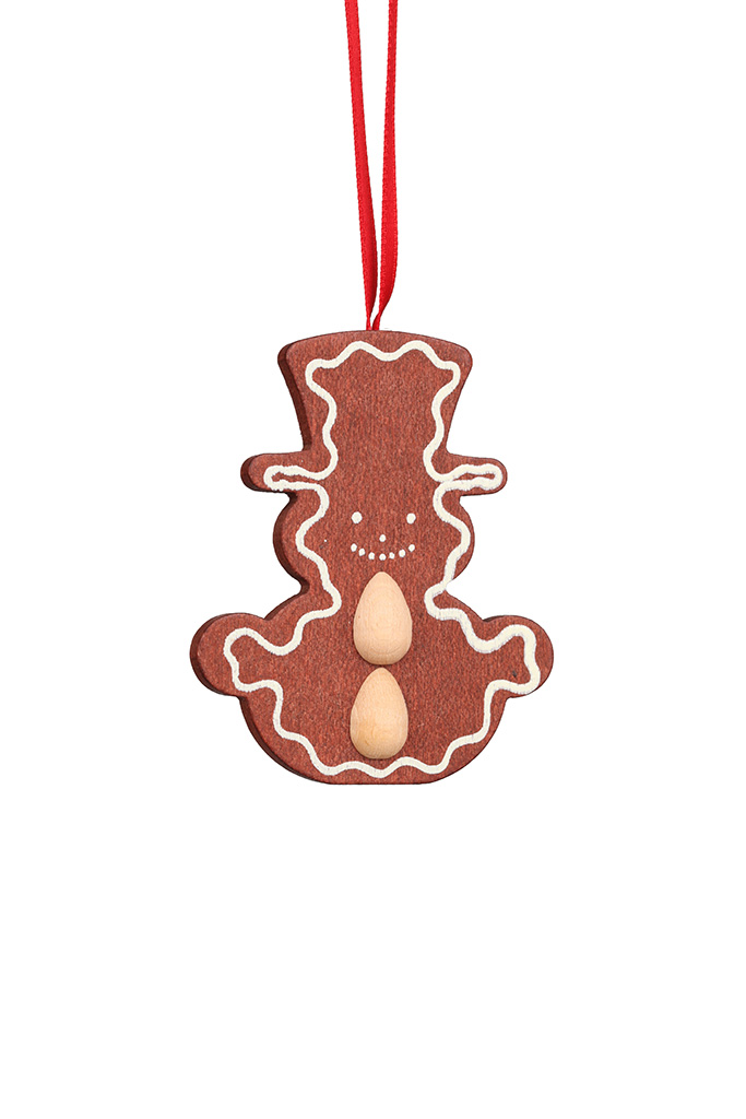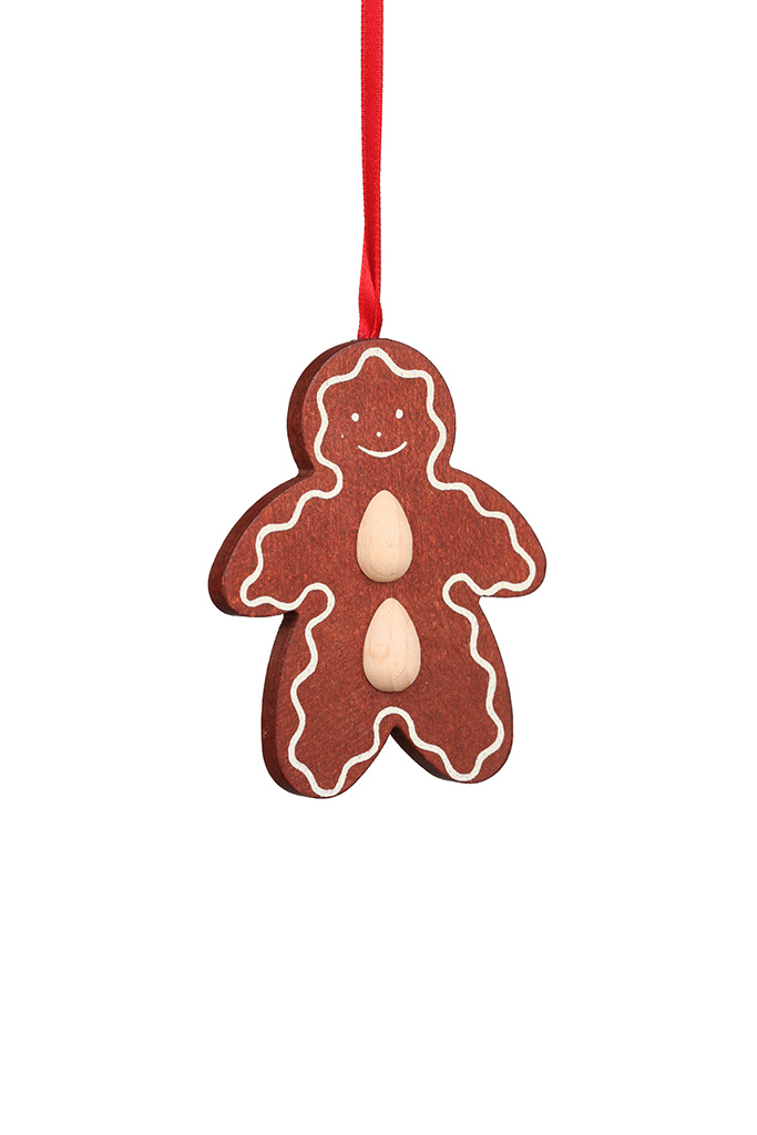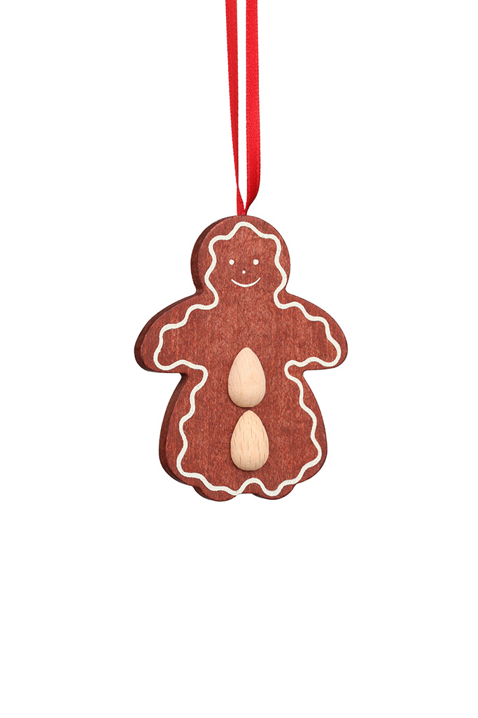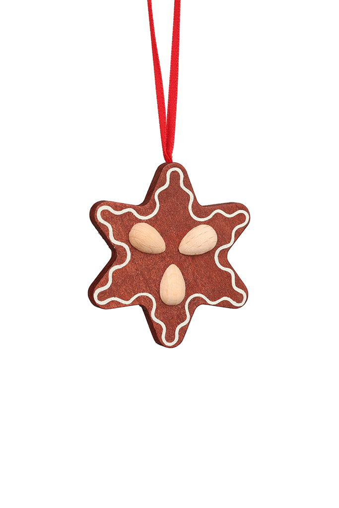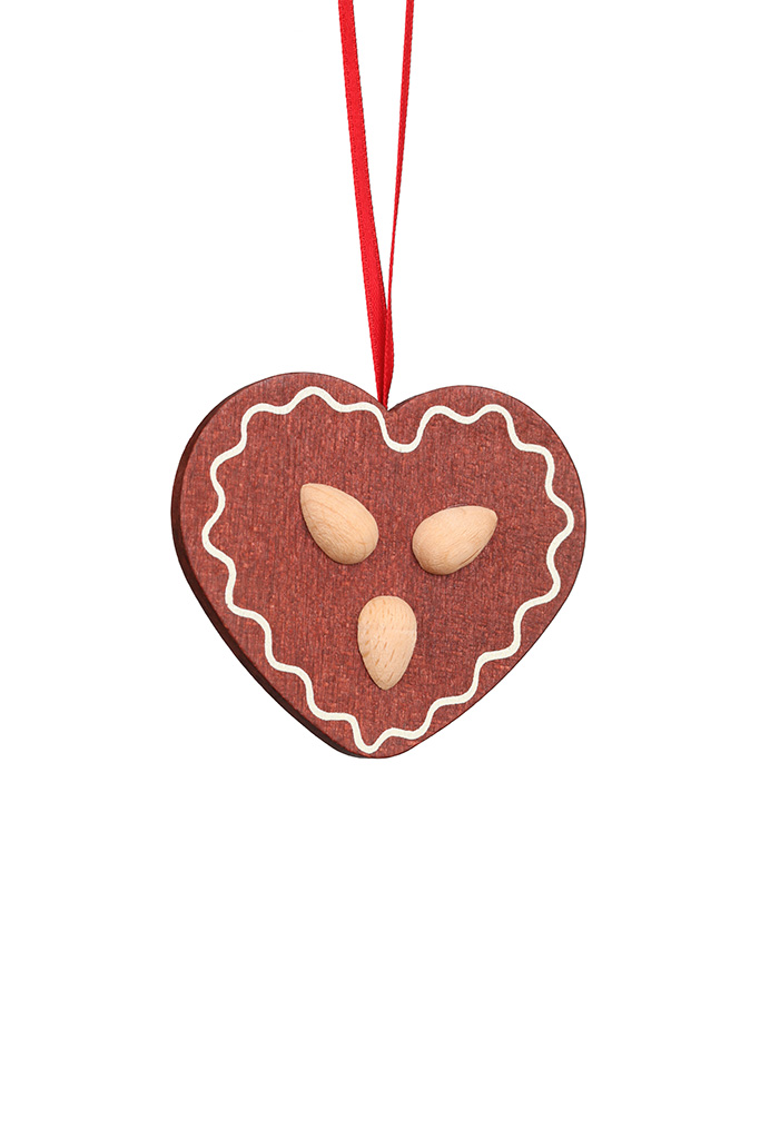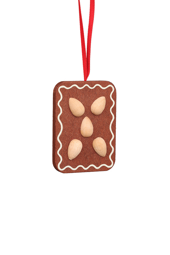 Lebkuchen in verschiedenen Varianten, verziert mit Mandeln und Zuckerguss, hängen mit roten Bändern zwischen grünen Tannenzweigen.