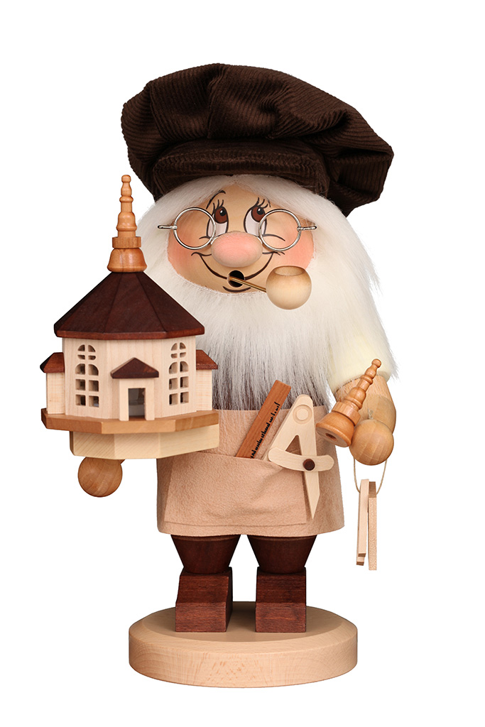 Er trägt das Wahrzeichen seines Heimatortes auf dem Arm. Hat er nicht ein tolles Lichterhaus geschaffen? Ein integriertes LED-Teelicht lässt die Seiffener Kirche leuchten. Ein Wichtel, der doppelt Stimmung verbreitet – Zum einen kann er den Duft einer Räucherkerze verbreiten und zum anderen sorgt die Beleuchtung seines Lichterhauses für tolle Atmosphäre. Ein Handwerker, dem wann seine Liebe zur Heimat ansieht.